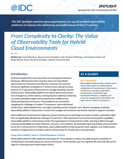 This IDC paper, "The Purpose and Power of an Alliance to Reduce AI Complexity and Maximize Value," sponsored by AWS in partnership with IBM, explores the latest challenges and solutions around the power of observability platforms.